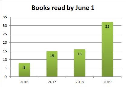 I’ve always been an avid reader but this year my reading has increased exponentially. I’ve religiously tracked my reading on Goodreads since 2016 and noticed my reading volume has doubled since the start of the year. Here’s my book counts as of June 1 over four years. Note that the spike in 2019 isn’t due to reading shorter books. I’ve already read more pages in 2019 than I did for all of 2018!