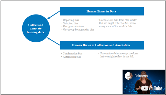 Through this site, I watched a lecture by Margaret Mitchell on fairness in AI. There are many stories about unintended bias in AI tools. A recent article about Amazon’s challenge with this made a lot of noise in the HR community. There are different types of human bias that can manifest in data: